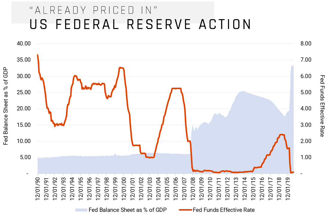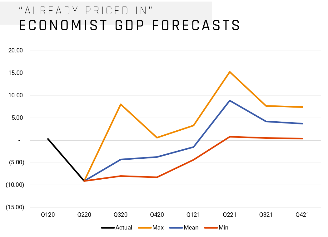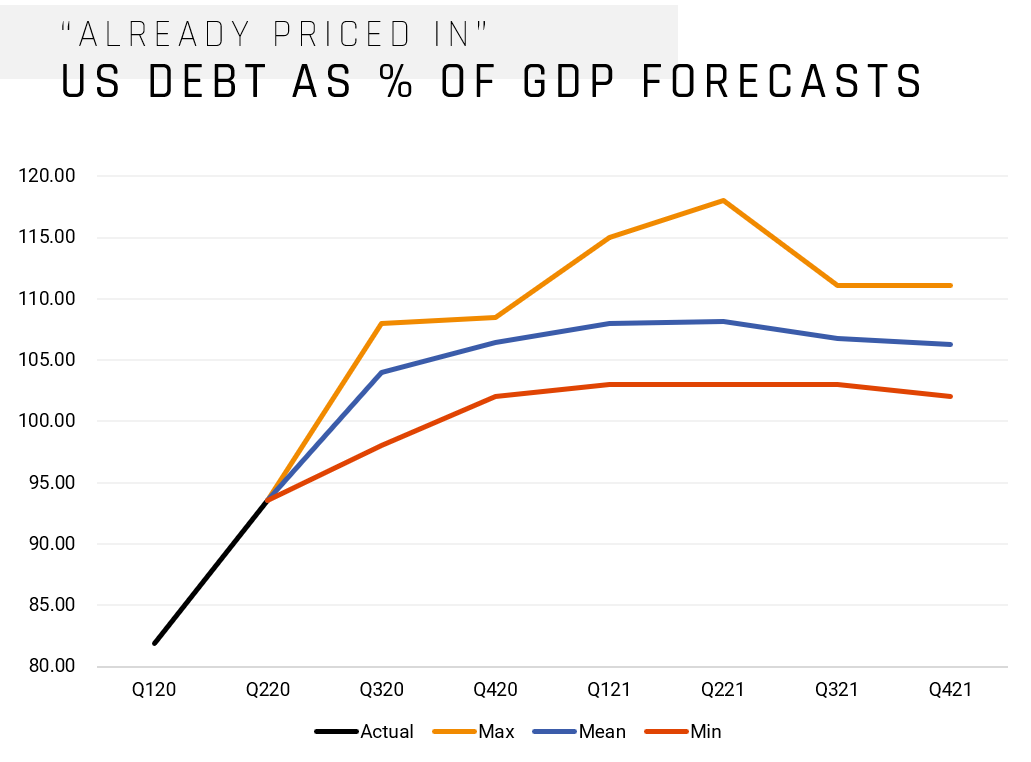 Of course, being priced in is a head nod to both markets incorporating all known information while simultaneously calibrating around expectations. If there is one thing that 2020 has taught us, our expectations of the future should be held with the humility of knowing how unknown the future really is. Looking at the expectations around significant macro figures can help us understand where the consensus lies and where an outlier could make an impact on market direction. Below are two charts highlighting consensus expectations regarding US GDP Forecasts and another regarding consensus expectations of US government debt as a percent of GDP. Both charts show the actual figure, as well as an upper, lower, and average range.