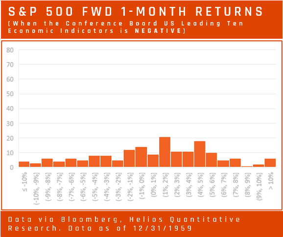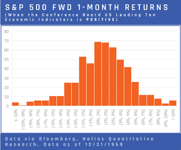 The chart below in blue shows the forward 1-month returns of the S&P 500 when the Conference Board US Leading Ten Economic Indicators are positive on a year-over-year basis, with data going back to 12/31/59. What do we see here? A relatively normal distribution of returns. AKA, not a huge likelihood of getting hit by a bomb.